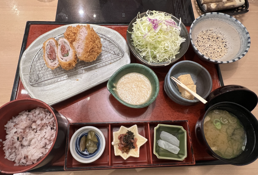 私はいつもあいもりの「十穀とろろと二種のカツ膳」を頼みます。梅が大好きな私はもち豚梅しそ巻きカツは絶対に外せないからです!