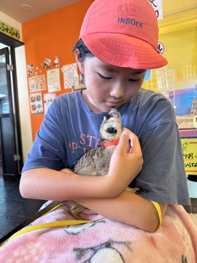 お姉ちゃんはミーアキャットを抱っこしてた^^めっちゃ人懐っこくて、可愛かった~!実は僕、ミーアキャット飼ってみたいんだ~