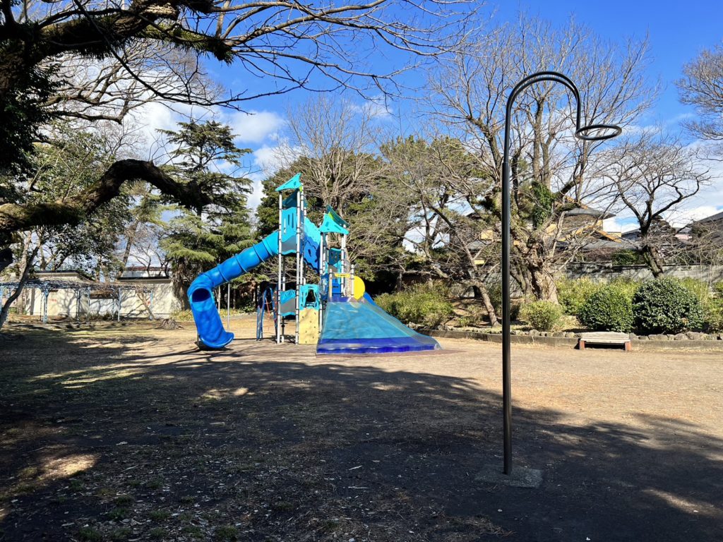 遊具はこんなのがあるよ。このブルーの大きな滑り台は最近できたばかりの新しい遊具だよ♪