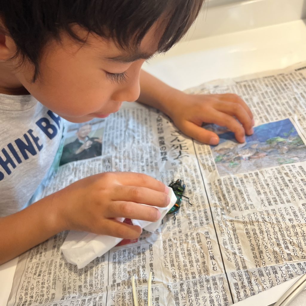 ①初めにクワガタの体の汚れをティッシュで綺麗に拭き取るよ。